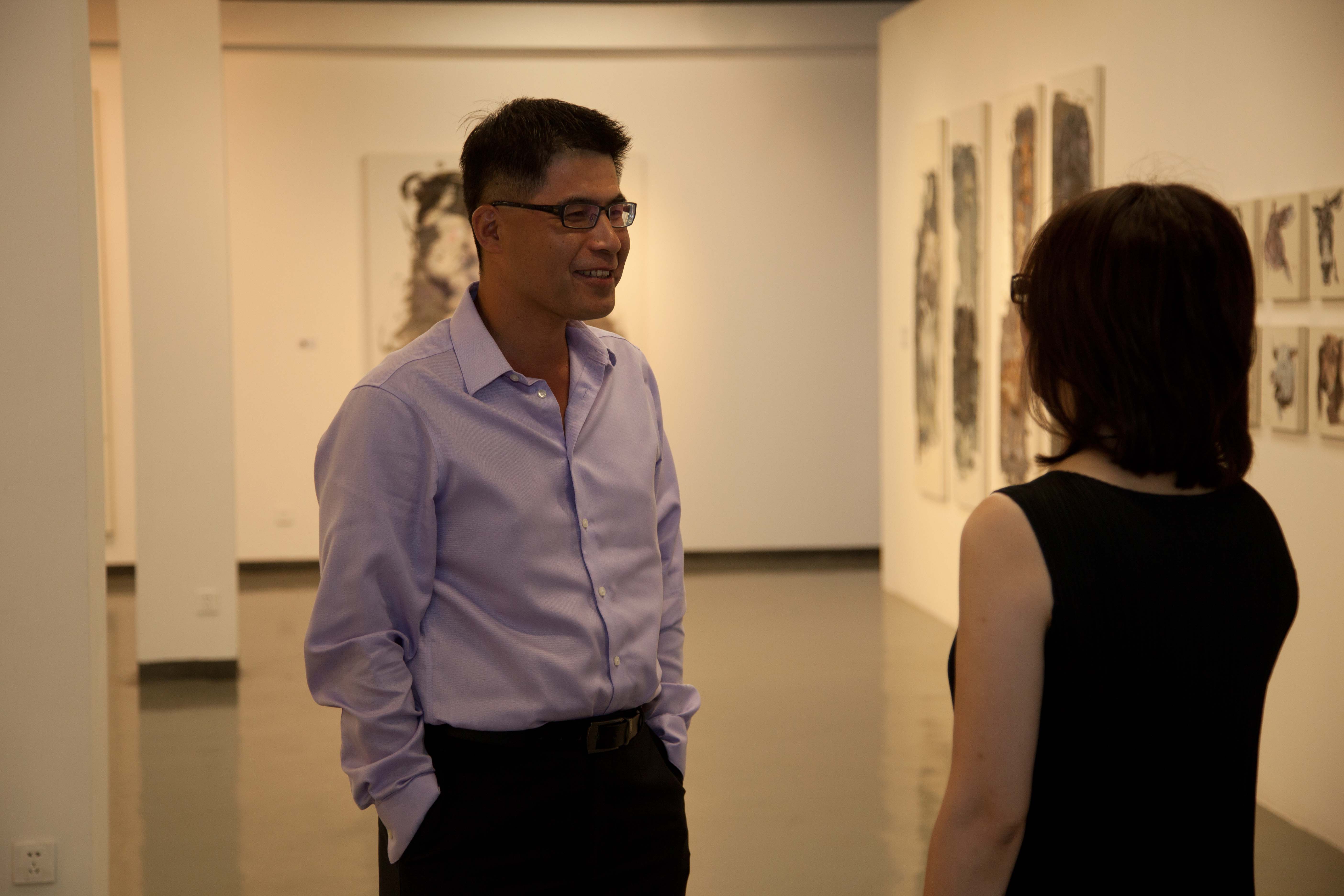 If paint is some primal material, or genetic soup, then in these paintings by Feng Shuo it has given birth to a strange world, a world turned on its head where animals talk and the only people in sight are young children. It might remind us of a children’s illustrated book – where anthropomorphism is so prevalent- but the mood is far more uncertain, indeed potentially savage and nasty. In one early painting do we see a doll or a child dismembered and half eaten on a table where owls and mice sit? This is the world of carnival where normal rules no longer apply, where the normal hierarchies are inverted, where animals pursue people, where the master serve the servants and the ridiculous rules. Carnival – long extinct in England but still thriving elsewhere in Europe – is where people once a year don masks so they can say whatever they want and act however they want. They stay up late, do not go to work, drink too much, play music loudly. But the next day they return to work and normality, refreshed and happier. In a place where such a carnival no longer exists it emerges in art as the carnivalesque.